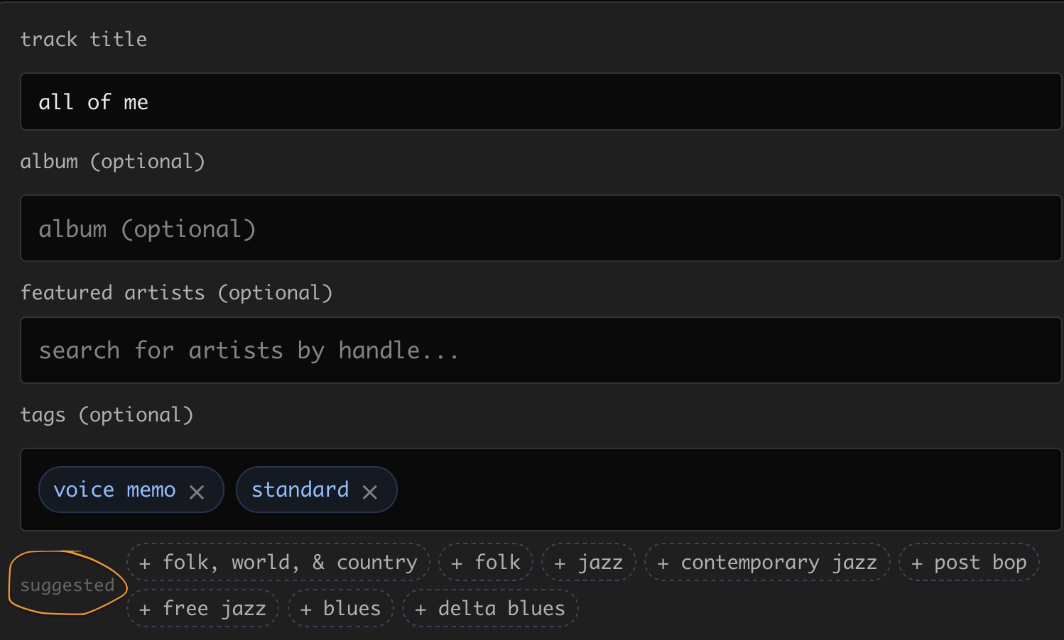 tracks are processed by effnet-discogs in the background on upload or on-demand via GET /tracks/{id}/recommended-tags. predictions (genre tag + confidence score) are cached keyed on audio content because someday i'm going to want to add support for swapping out the audio file for a given track you've already uploaded.