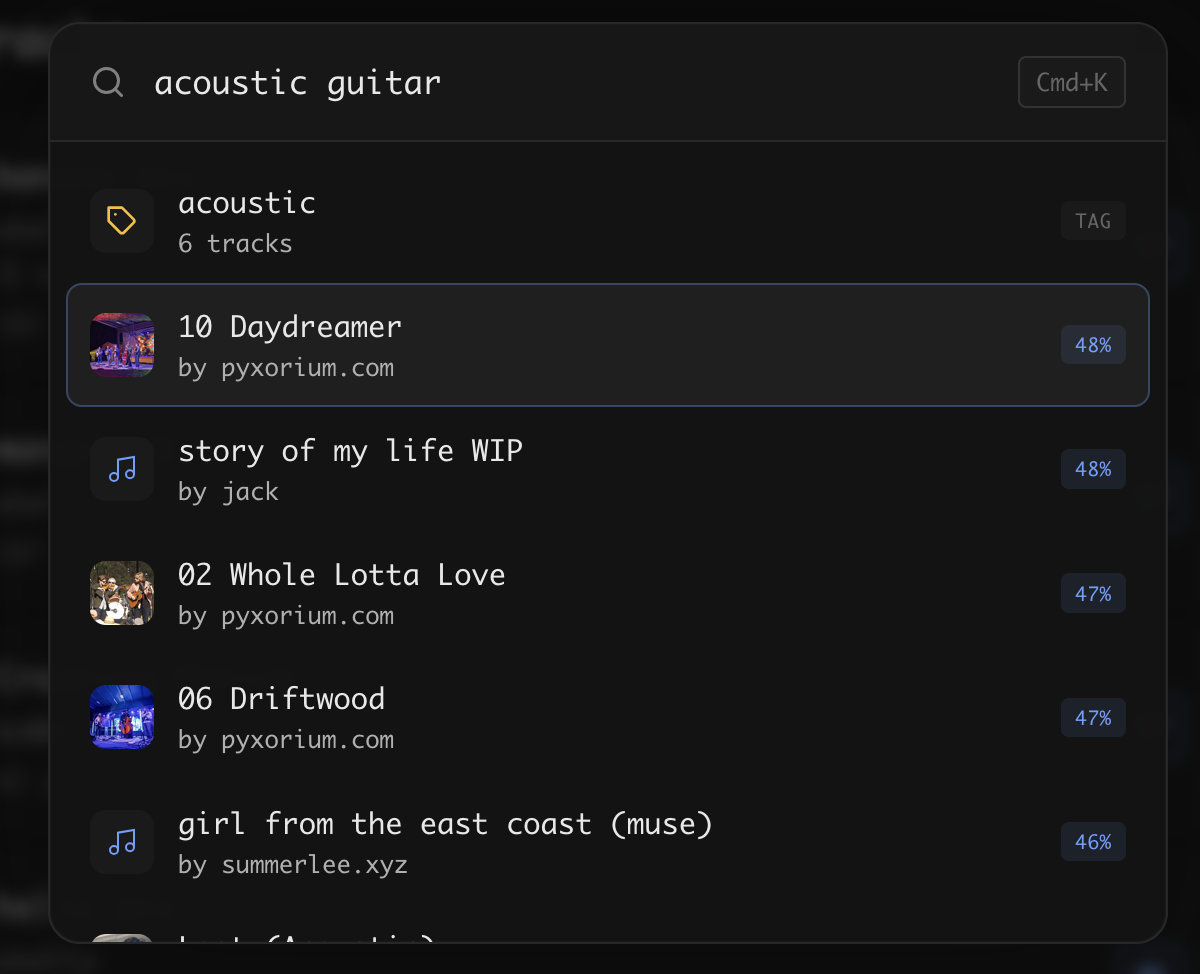 read more about how this works in the docs, but essentially i am running CLAP on modal with turbopuffer to store embeddings to power recommended tracks and semantic search